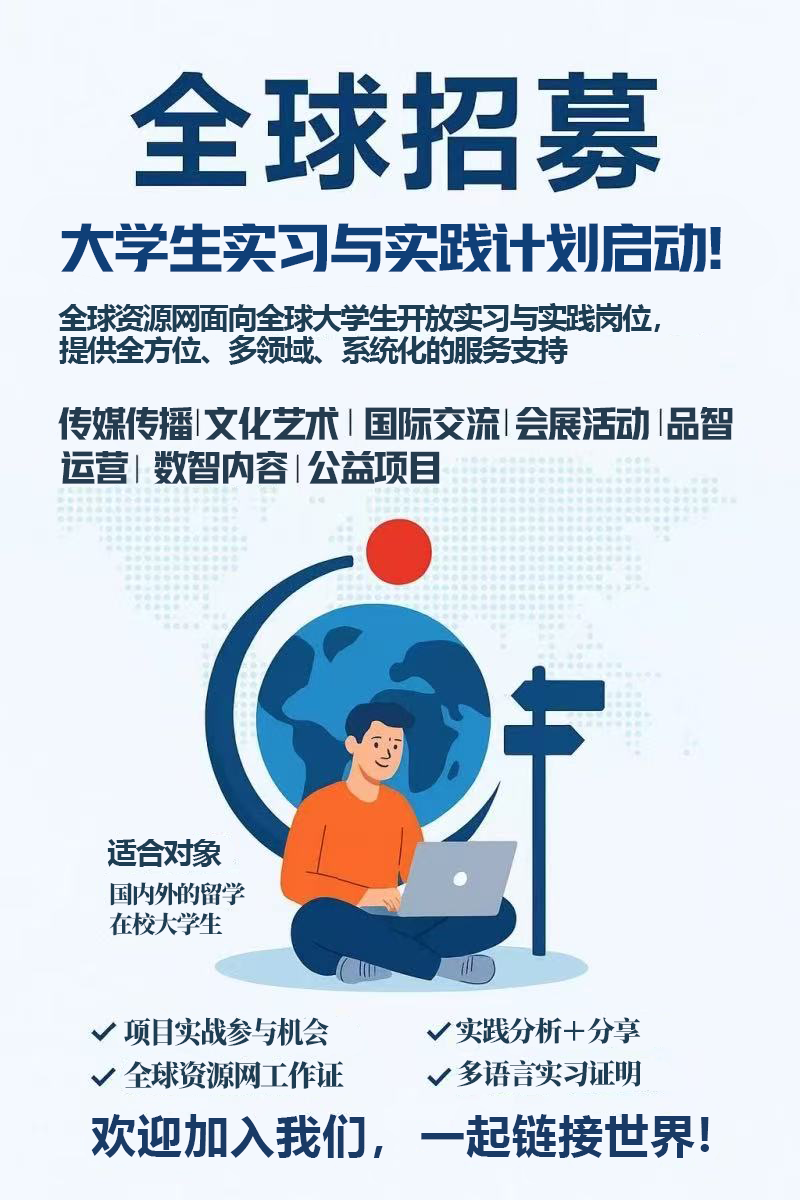 全球资源网面向全球大学生开放实习与实践岗位,提供全方位、多领域、系统化的服务支持,助力青年人才深入接触真实项目、拓展国际视野、提升综合能力。