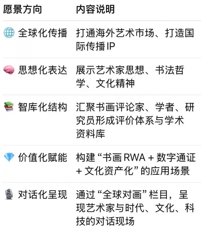 通过对话、展览、访谈、研究、通证化、教育等手段,推动书画从艺术走向认知、从文化走向价值、从孤品走向共建共识。