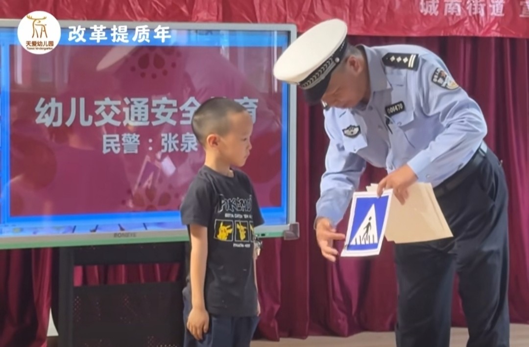 全球资源网北京资讯频道(路海峰)讯:为进一步提高幼儿和老师的交通安全意识,有效预防和减少道路交通事故发生,马池口交通队民警张泉与城南街道警务站工作人员共同走进天爱幼儿园,为孩子们开展“交通安全第一课”。