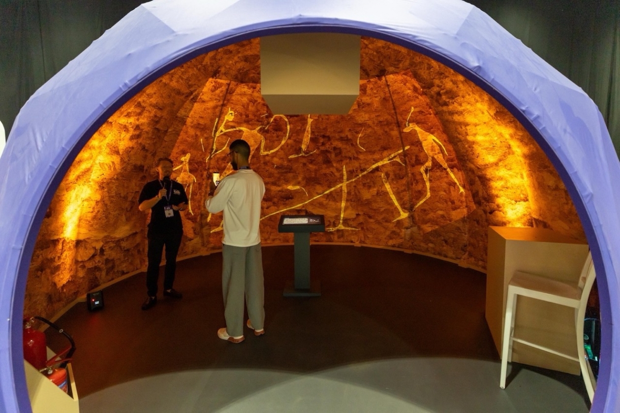 而在众多面向未来的展位之外,“内容的起源(Origin of Content)” 则将人们带回遥远的过去——石器时代洞穴。参与者利用现代工具进行数字绘制,作品会瞬间转化为洞穴壁画风格,将最前沿的技术与人类最原始的叙事冲动巧妙融合。