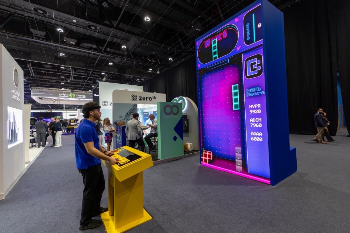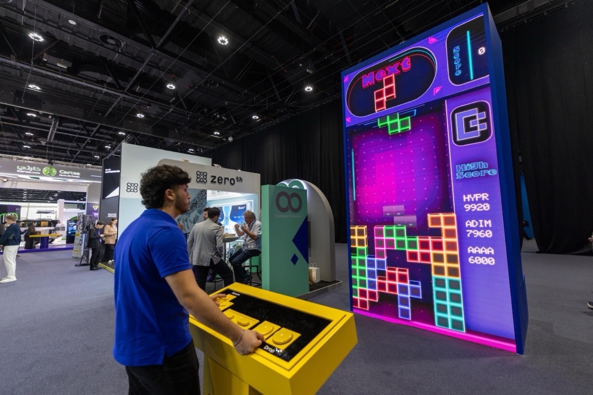 年轻观众则聚集在 “巨型吃豆人(Mega Pac-Man)” 与 “巨型俄罗斯方块(Mega Tetris)” 屏幕前,在会议间隙尽情释放活力,重温经典游戏的乐趣。