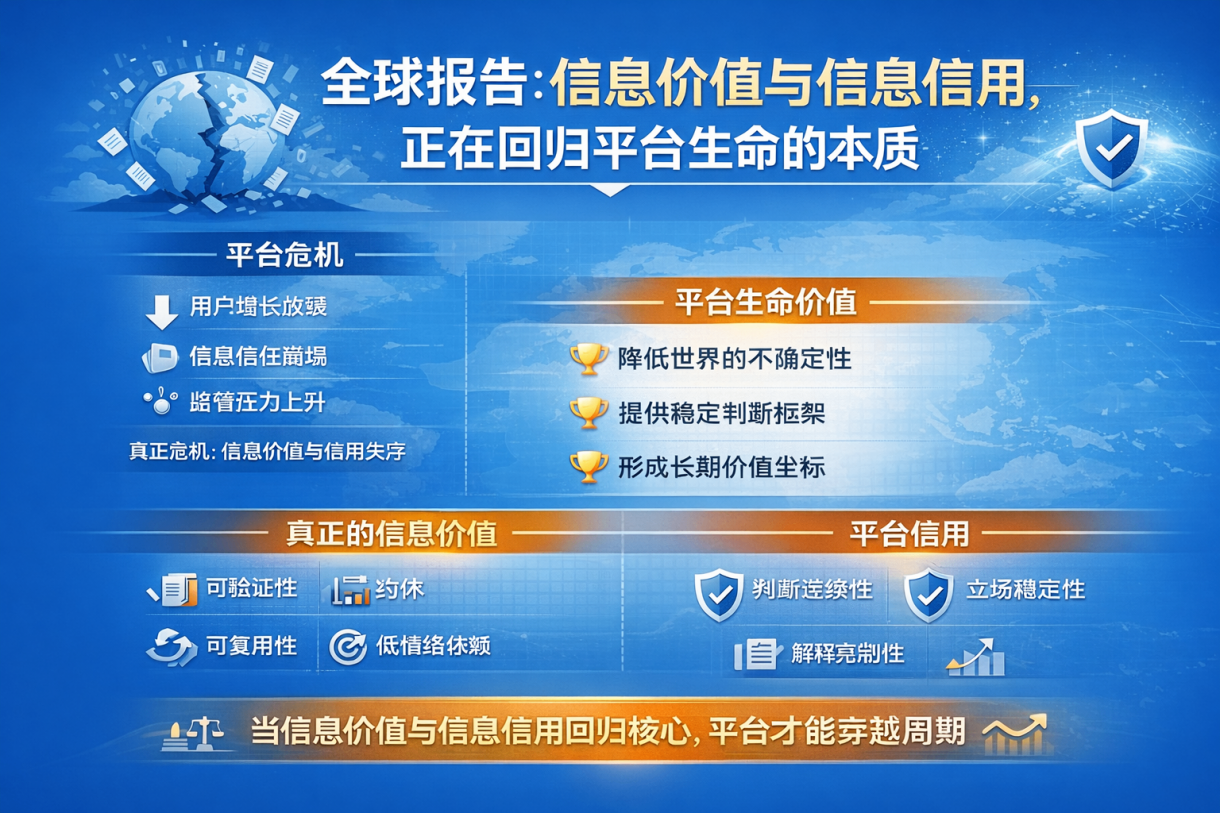全球资源网综合频道:在全球平台普遍遭遇信任衰减与增长放缓的背景下,真正的危机并非流量消失,而是信息价值与信息信用的失序。信息若不能降低不确定性、支撑判断与决策,便失去平台意义。未来平台的生命力,取决于是否持续提供可验证、可复用、低情绪依赖的信息,并通过判断连续性、立场稳定性与解释克制性,重建长期信息信用,实现穿越周期的价值存在。