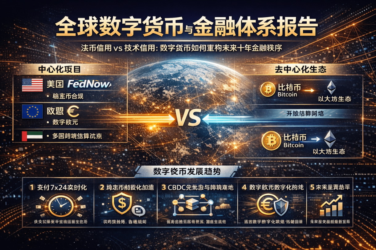 这一轮重构的关键,不是某一种币胜出,而是两条路径并行推进:中心化的国家与机构体系升级(实时支付、稳定币合规化、CBDC/批发型CBDC试点),以及去中心化的开放网络体系(比特币、以太坊及其生态作为“开放式结算层/价值载体”)。