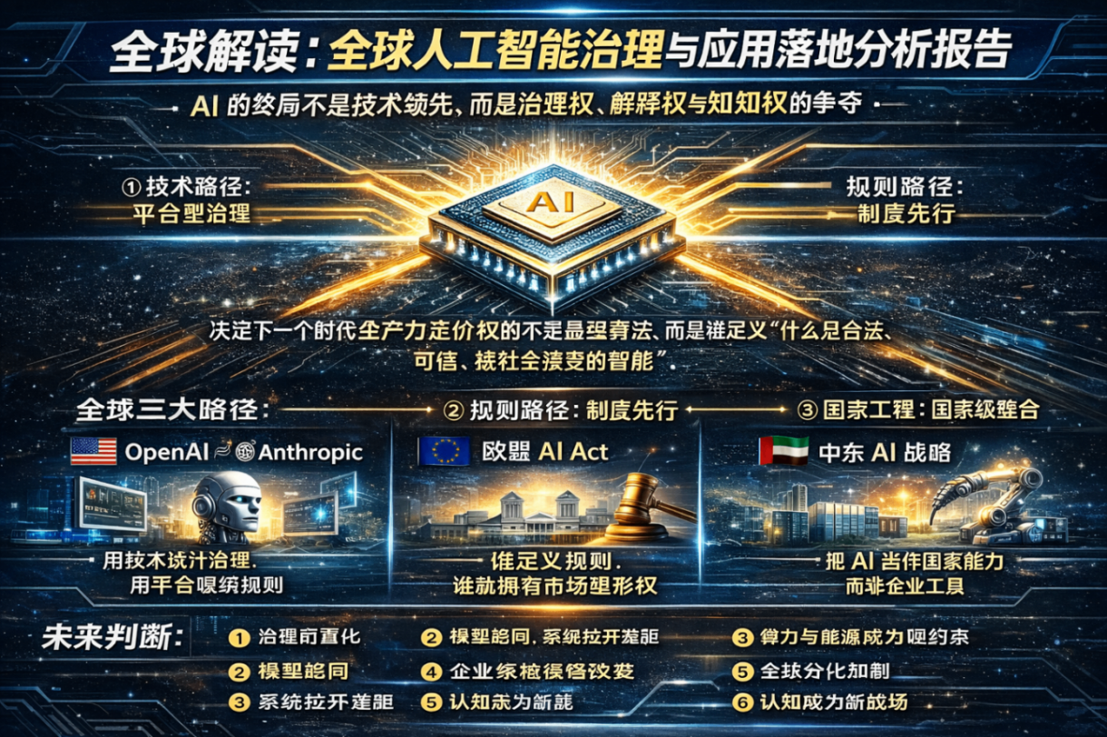 全球资源网科技频道:从模型竞赛走向治理权与认知权之争。全球人工智能正从技术竞赛走向治理与认知重构。OpenAI、Anthropic代表平台化技术路径,欧盟以AI Act塑造规则主权,中东以国家工程推动场景落地。AI既是生产力革命,也是权力重组工具。未来竞争不在模型强弱,而在谁掌握治理权、解释权与社会认知权。