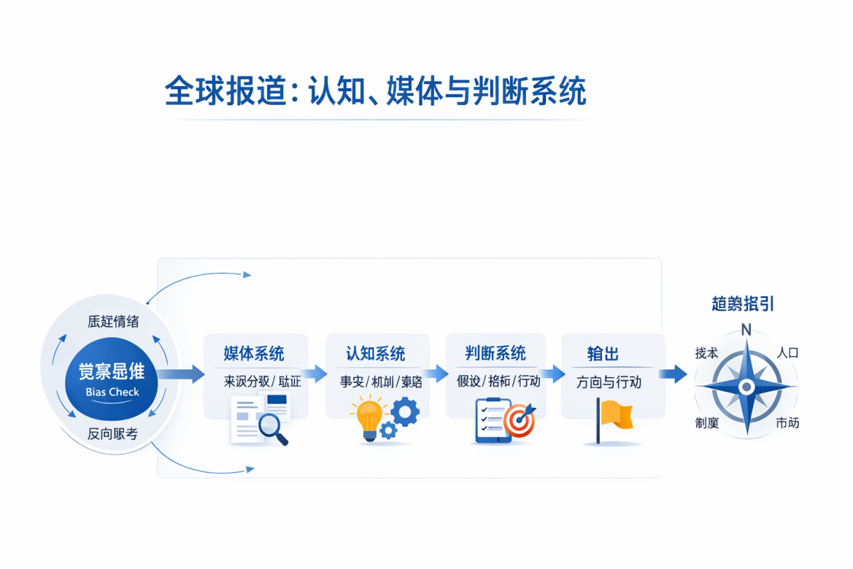 全球资源网摘要:当代社会的核心稀缺资源不再是信息,而是可信的解释与可执行的判断。在全球化风险回潮、技术范式跃迁、媒体平台化与算法化叙事并行的背景下,个人与组织面对的不是“知道得不够多”,而是“在噪音中难以形成稳定、可校正、可落地的判断”。本文提出一套可操作的“认知—媒体—判断系统”,并将其升级为国际智库常用的分析路径:以证据链为底座,以机制解释为核心,以情境化决策为输出;同时引入“觉察思维”作为反偏差的内生校正装置,使判断具备可复盘性与可迭代性。最终目标是:基于趋势与约束,客观定位个人发展方向与组织战略路径。