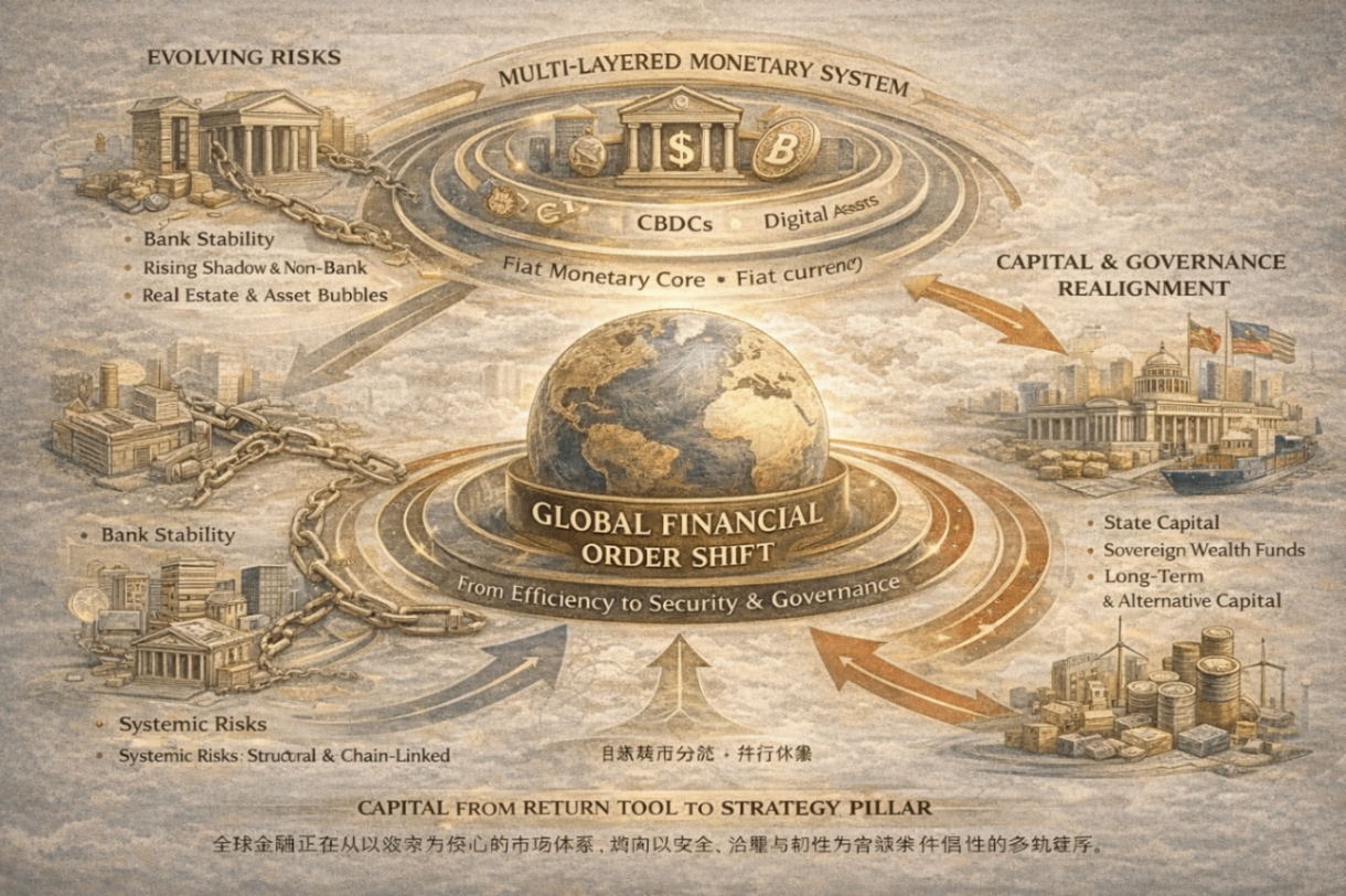 全球金融体系并未走向崩溃,也尚未完成重构。它正处在一个过渡阶段:旧的效率逻辑仍在运行,新的安全与治理逻辑正在上升。真正的变化,不在市场表层,而在制度深处。在一个高度互联、风险可快速传导的世界里,金融不再只是资本的游戏,而正在重新成为国家治理能力与全球秩序的一部分。理解这一转向,或许比预测下一次危机,更为重要。