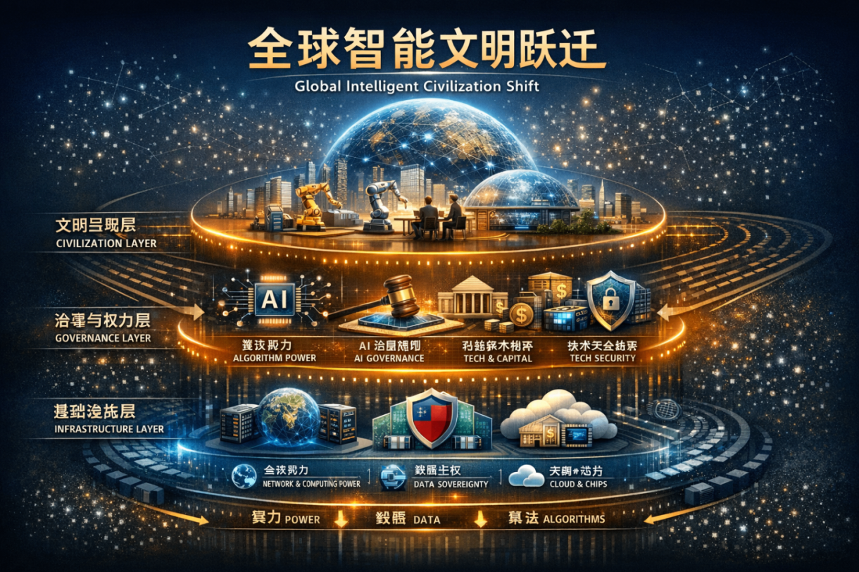 21 世纪 20 年代中期,人类文明已明确跨越“信息文明”,进入一个以人工智能、算力基础设施、数据主权与算法秩序为核心变量的智能文明阶段。这一阶段的本质,不只是技术升级,而是:
