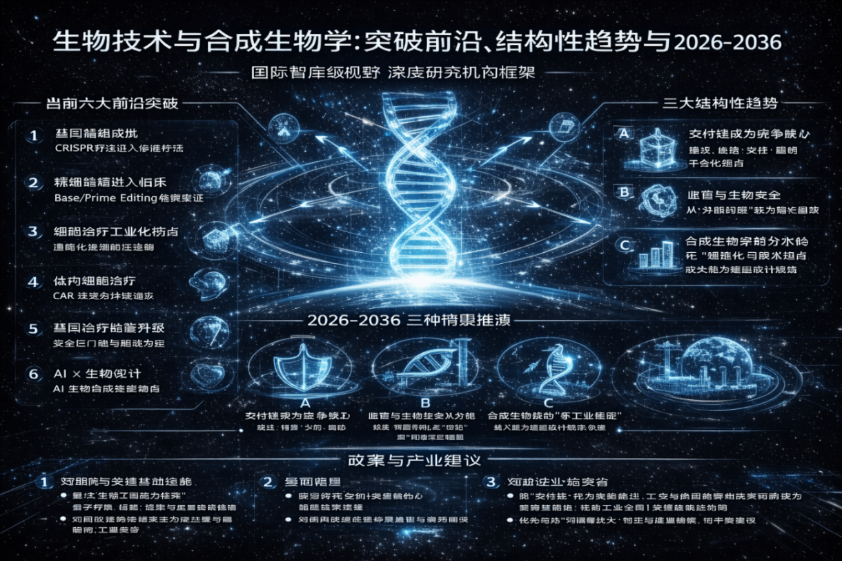 生物技术的未来不是单点突破,而是“可工程化的生命系统”逐步进入医疗与工业。决定性变量将从“能否做出疗法/产品”转向“能否安全递送、规模制造、合规运营并把成本打下来”。这将塑造2026–2036全球医疗体系的可及性边界,也将决定合成生物学能否成为下一代工业路线。