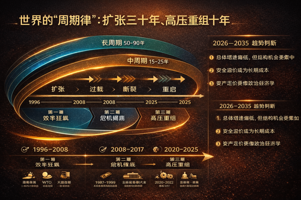 长周期决定世界处在“开放扩张”还是“高压重组”。开放扩张期的关键词是:效率、全球分工、规则扩张、资本自由流动。高压重组期的关键词是:安全、阵营化、技术边界、供应链本地化与冗余。