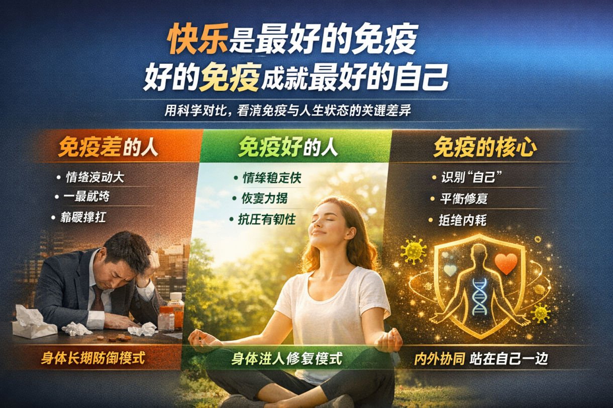 先看一组现实中极常见的对比。第一类人:不快乐但很拼,他们长期处在紧绷状态,高自我要求,很少真正放松。情绪被压住,用意志力硬撑生活和工作结果往往是:睡眠浅、恢复慢;容易反复感冒、炎症;一累就垮,小问题拖成大问题。原因并不神秘。身体长期处在“威胁—防御模式”,免疫系统被迫优先处理应激反应,修复与调节的空间被持续挤占。第二类人:稳定快乐、节律清晰,他们并不一定更聪明或更努力,但情绪可调节,边界相对清楚,不长期自我攻击,也允许自己恢复。