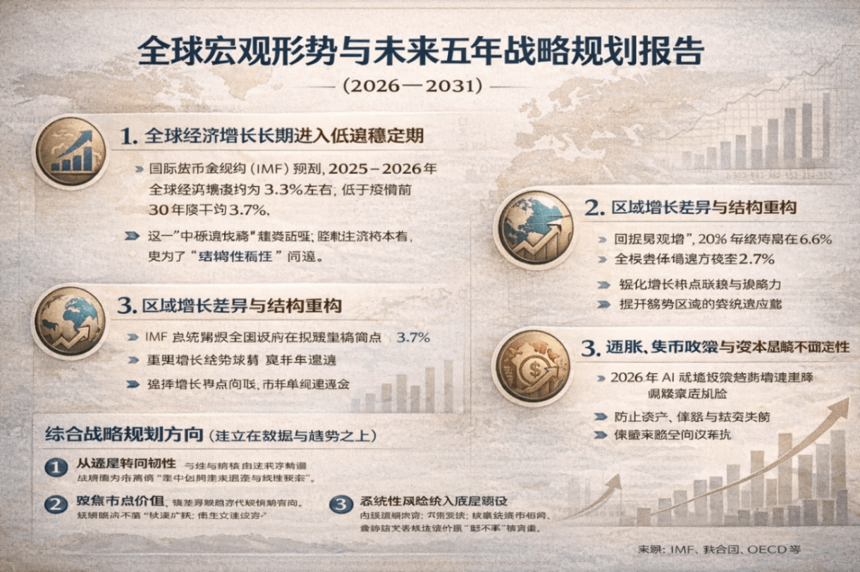 全球资源网国际频道:(2026–2031)未来五年,全球将进入低增长、高波动与结构重组并行的阶段。地缘冲突常态化、经济分化加剧、技术与资本周期叠加,决定战略应从追求速度转向提升韧性与判断力,聚焦关键节点、构建可调整的长期发展能力。