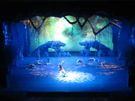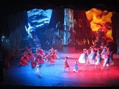 [中关村在线投影机频道转载]近期,作为“2011年北京市舞台艺术新剧目展演” 剧目, 由北京市歌剧舞剧院创排的大型原创舞剧《女娲》在北京国安剧场上演,5台高亮度科视投影打造了15米×7.5米的主背景画面和18米×7.5米的纱幕投影,恢弘神秘的布景画面定格出上古的悠远,风云之舞与现代投影的互动则交织出现代的时尚。