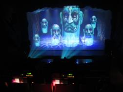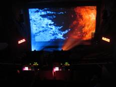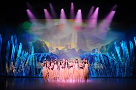 在这一探访华夏始祖的灵魂之旅,主要影像显示采用了5台科视Roadster S+20K 20000ANSI流明的高性能投影机:其中三台侧立放置,拼接融合成一个15米×7.5米的画面投射到背投软幕上,投影机放置的位置是舞台的最末端,末端有一个斜坡,投影机放在斜坡后面靠下的位置隐藏安装。支架高约2米,都是装在单独制作的吊笼里,为的是方便调整姿态和便于投影机散热。使用的是0.67广角镜头;舞台前方,位于二层看台的最前沿摆放两台投影机,拼接融合出18米×7.5米画面,使用1.8-2.6标准镜头,投射在半透纱幕上。从而,视频的幻影迭加,将静谧的宇宙苍穹、斑斓的万物众生、伤怀的万物凋零,以及女娲炼石补天等一系列场景营造得惟妙惟肖,极具视觉震撼力。