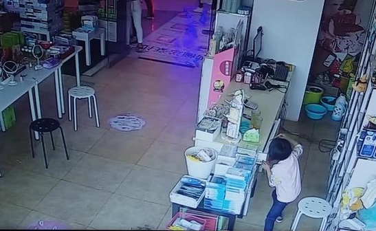 4时47分07秒,小女孩半蹲着拉开抽屉,迅速拿起手机,然后拉开上衣领,将手机放进衣服里,整个过程仅用时5秒。走出收银台后,小女孩看了同来的女子一眼,便径直走出店门。同来的女子及店面北门的两名女子先后在6秒钟内离店。
