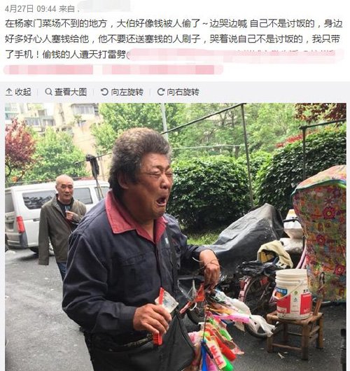 4月27日,有杭州网民在微博称:“在杨家门菜场不到的地方,卖刷子的大伯好像钱被人偷了,边哭边喊自己不是讨饭的,好多好心人塞钱给他,他不要,还送塞钱的人刷子,哭着说自己不是讨饭的!偷钱的人要遭天谴的。大伯说是给妈妈看病的钱!求抓住小偷!扩!”并称“跑回去找他的时候给他塞了五十”。该微博受到媒体和热心网民的关注。一些人留言称“可以十倍的价格买这位老伯的东西”、“怎么样才可以帮他?真的太心酸了”,还有一种观点谴责小偷“盗亦有道,不该偷穷苦人的东西”。