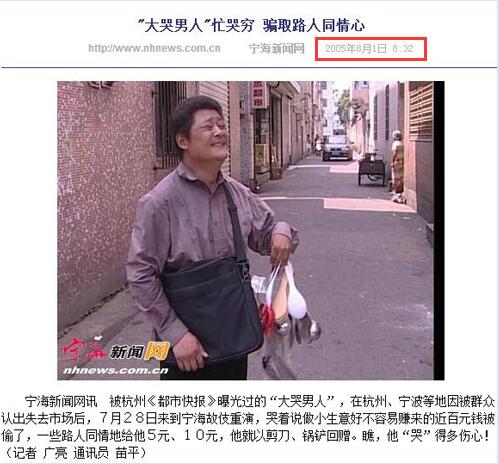 人民网北京4月30日电 (记者孝金波)近日,网络热传“男子救命钱被偷,当街边哭边喊自己不是讨饭的。身边好多好心人塞钱给他,他不要,还送塞钱的人刷子”。然而随着爱心求助微博的扩散,该“大哭男人”却被揭穿十余年前就曾以相同戏码搏同情,真相一出,不少网民戏谑称其为“十年老戏骨”。