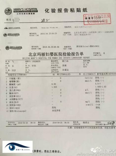 马女士说,对于检查结果,医生推说宫外孕可能性较大,本身需要做刮宫手术进行诊断。几天后,她再次到医院,要求院方出具术前检查报告,发现其术前尿检结果已为阳性,即怀孕。