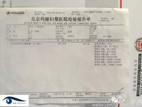 据北京玛丽妇婴医院尿液检查报告单显示,其尿HCG结果呈阳性,报告时间为4月25日8点56分,即术前。另据该院血液检查报告单显示,其人绒毛膜促性腺激素HCG结果441.810,为怀孕1到2周,报告时间为4月25日12点12分。而在该院诊断性刮宫知情通知书上,术前诊断为“内膜增生”,手术适应症为“除外内膜病变”,该通知书并未体现马女士怀孕。