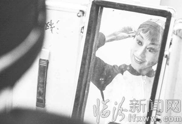 4月26日,记者跟着小梅花剧团来到了西芦村,程雅琨要在这里演出三天,随后还要去曲沃演出四天。这场她演的是《蝴蝶杯》中的女主角胡凤莲。期间,她要换五身衣服。一场戏一般都是两个小时40分钟左右,两场戏之间间隔两三分钟,在这短暂的时间里,她需要换头带和衣服,所以比较紧张,有时候连喝水的时间都没有。