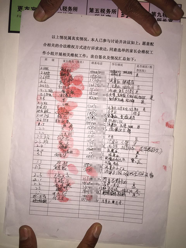 教科院附小家长出具的一份近期出现的学生不良症状统计表,上面有96名家长的签字和指印。 澎湃新闻记者 赵孟 图