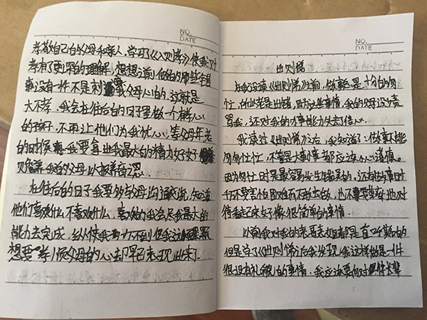 除了像饭店其他员工一样正常工作外,陈超还在保证人郭经理的安排下,每晚待在房间内观看《中华传统文化论坛》系列碟片,做文化补习。按照约定,陈超要每日习读弟子规,每周写读后心得交给郭经理。刚开始那几天,陈超经常拖延;郭经理督促多次,他养成了按时写心得的习惯,而保证人和观护帮教人员也能从中及时了解到他的思想动态。