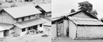 由中国电建集团老挝南欧江流域发电有限公司建设的老挝琅勃拉邦省孟威县帕景村新移民村建筑(左),极大改善了当地村民生活居住环境。右图为搬迁前的旧房子。 |