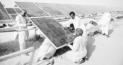 2015年8月27日,在巴基斯坦旁遮普省巴哈瓦尔布尔地区,当地工人在中兴能源900兆瓦光伏地面电站安装太阳能电池板。该电站总投资额逾15亿美元,是中巴经济走廊的优先实施项目之一。 |