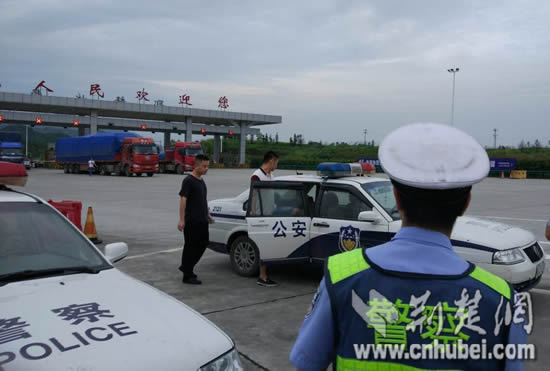 18时23分,嫌疑车辆驶入鄂赣收费站广场,民警速拦停前方货车,防止嫌疑车辆冲卡逃窜,同时将后方车辆引导至同一车道,将嫌疑车辆夹在中间。民警上前,以超速为由对嫌疑车辆进行检查,要求驾驶员将车辆熄火并到执勤岗亭进行处理。