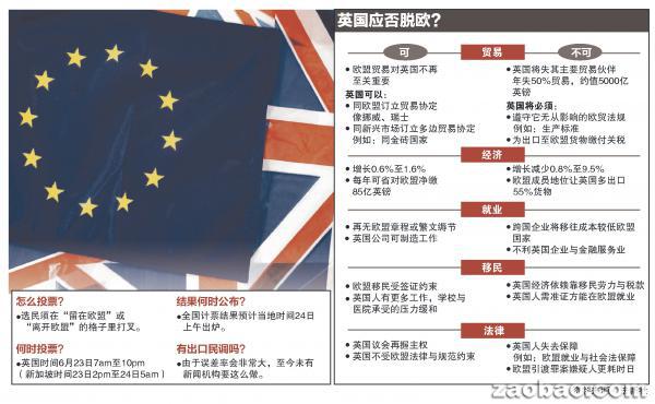距离公投还剩几天,留欧派纷纷喊话。英国首相卡梅伦说:“我完全肯定一旦我们脱欧,经济将遭受打击。”英国财长奥斯本也提醒,离开欧盟的英国将比现在“穷很多”。诺贝尔经济学奖的10名得主警告,脱欧将对英国的贸易国地位“制造重大不确定性”,并造成持久的经济破坏。