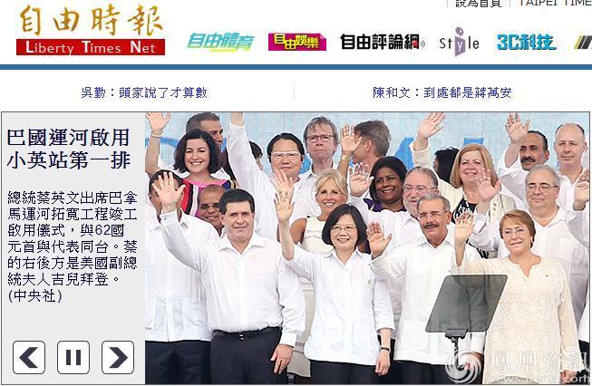 在巴拿马运河拓宽竣工启用仪式上,蔡英文与多国元首合影,并被安排在第一排亮相。对此,岛内绿媒嗨翻了天,“巴国运河启用,小英站第一排”、“小英与美副总统夫人自然互动”、“蔡穿巴拿马衫,会晤我四友邦”。