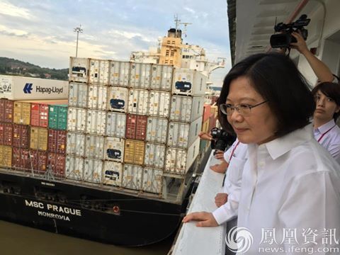 当地时间26日清晨7时50分,货轮在巴雷拉和众多嘉宾,以及好奇民众的注视之下,穿越巴拿马运河大西洋一侧的船闸,标志扩建之后的运河正式启用。货轮穿越全长约80公里的运河、抵达太平洋一侧大约需要8小时。而蔡英文就在这些观礼嘉宾之中,她频频抬头,和众人一道“见证”了大陆货轮领航新巴拿马航道的开启。