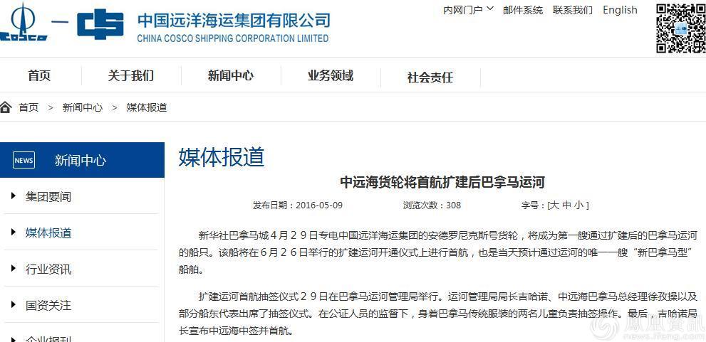 这是第一艘通过新竣工巴拿马运河船闸的——中远集团的集装箱轮。