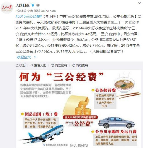 受国务院委托,今天财政部部长楼继伟向十二届全国人大常委会第二十一次会议作2015年中央决算报告。据报告显示,2015年中央行政事业单位财政拨款的“三公”经费支出合计53.73亿元,比预算数减少9.43亿元。“三公”经费中,因公出国(境)经费17.44亿元,比预算数减少1.94亿元;公务用车购置及运行费30.87亿,减少3.72亿元;公务接待费5.42亿元,减少3.77亿元。据了解,2013年中央三公经费合计70.15亿元,2014年为58.8亿元。(人民日报记者董宇)
