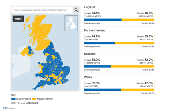 公投结果示意图,苏格兰62%的选民赞同留欧