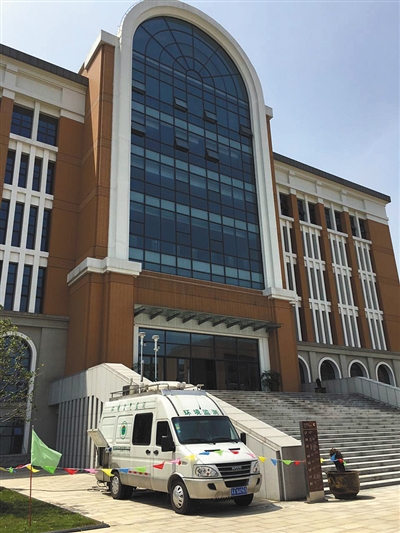常外事件后,环境监测车辆停在教学楼下监测空气。