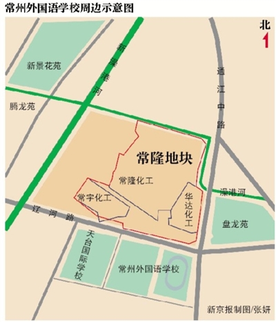 “常外”事件后,位于常州龙虎塘街道的常隆化工原厂址成为焦点。常州外国语学校位于这个原厂址的南侧,仅隔一条马路。