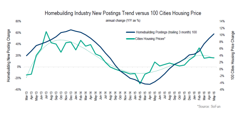 图2:2013年5月至2016年5月,房屋建筑就业机会(绿色)和100个城市房价(蓝色)走势对比图。