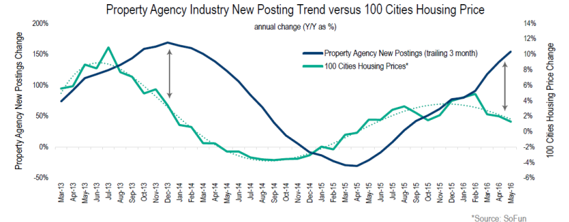 图1:2013年5月至2016年5月,房地产中介新增就业机会(绿色)和100个城市房价(蓝色)走势对比图。