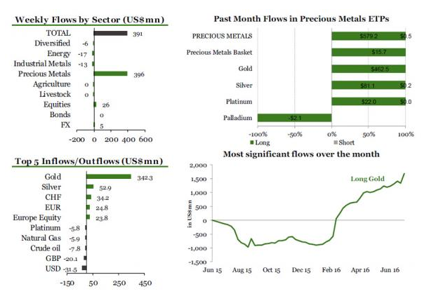 因为市场不确定性的持续,作为避险天堂的黄金的需求不断上升。上周做多黄金,白银和瑞士法郎资金达到创纪录的4.335亿美元。7月1日周五黄金ETP的资金流入达到2.63亿美元,创有史以来最高纪录。