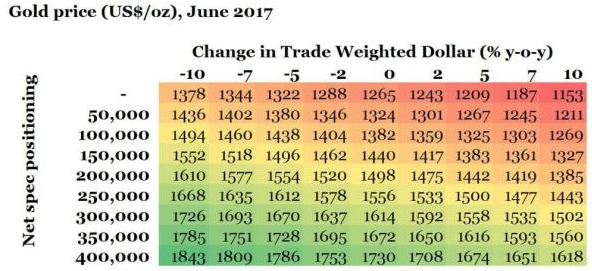 图:不同的净投资仓位和美元指数情况下,黄金价格到2017年6月的预期。