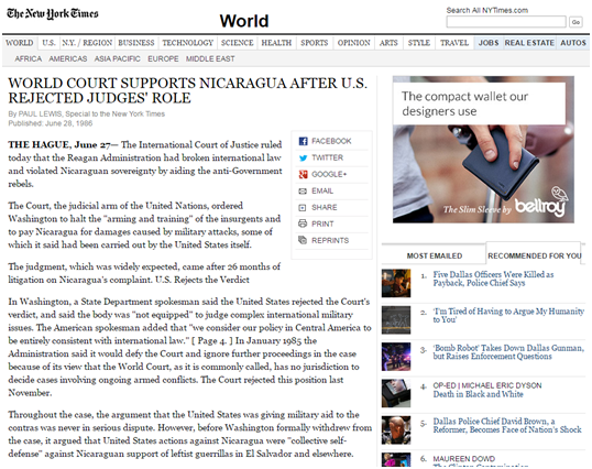 美国退出国际法院并未阻止案件审理。1986年6月27日,国际法院对案件作出16点判决——美国在尼加拉瓜境内的行动违反禁止使用武力原则,构成对尼非法使用武力和以武力相威胁;美支持尼反政府武装是对尼内政的干涉,明显违反不干涉原则;美国对尼加拉瓜的行动违反尊重国家领土主权原则;美国鼓励尼反政府武装从事违反人道法原则的行为,美国在尼港口布雷造成第三国船舶及其人员的人身、财产损害的行为也构成对人道法原则的违反;美国有义务立即停止并不再采取任何上述违背其国际义务的行为,并对造成的损害予以赔偿,赔偿总价为3.7亿美元。