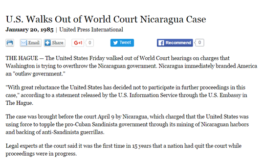 美国参与了管辖权部分的听证,并不遗余力地论证国际法庭对此案没有管辖权。11月26日,国际法院拒绝美国的辩解,坚持称国际法院对此案具有审判权。次年1月18日,美国退出国际法院,指责该案件是“出于政治和宣传目的错误利用国际法院”。美国国务院发言人称,我们希望国际法院没有走上其他一些被政治化、反对西方民主国家利益的国际组织的老路。这是美国自1946年加入国际法院以来第一次宣布退出,且至今也没有回到国际法院。