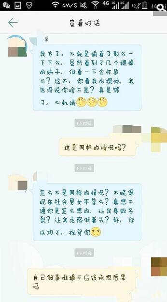 举报者小琴向记者提供了一张自称“看了几个裸着女生”的男生与女大学生的交流聊天截屏。交流中,这名自称“偷窥”男子称:“虽然我看到了几个裸着的女生,但是看一下又不会怀孕,更何况你看了我的裸体(上半身没穿衣服)我也没说啥,是不?”