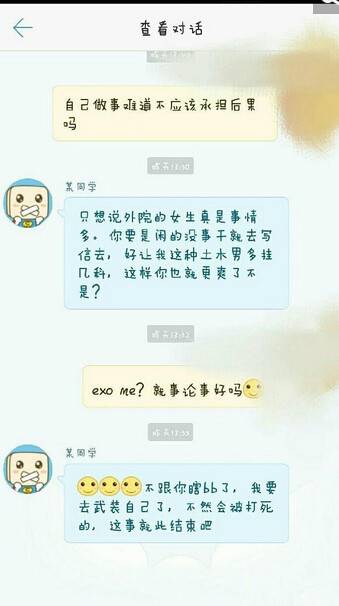另外有女生提出该男子应该承认错误并承担后果时,该男子称:“只能说外语学院的女生事情真多,你要是闲的没事就去写信,好让我们土木专业的男生多挂几科,这样你也就更爽了。”小琴表示:“被男生在宿舍用望远镜偷看经常发生,只不过这次这名男生被我们发现了。并且拍照记录下来了。”