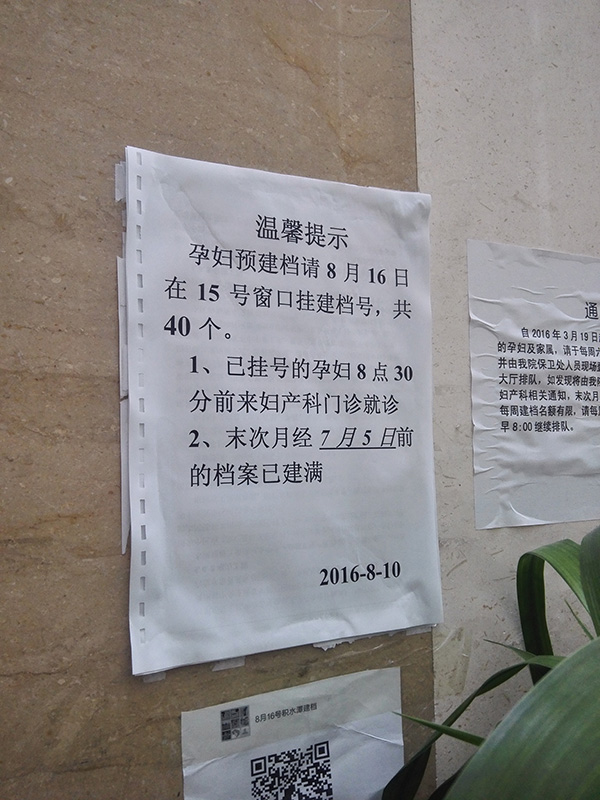 记者注意到,该院妇产科大厅贴出的通知显示:“2017年4月20日之前预产期的建档名额已满。”