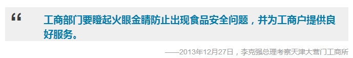 2013年12月27日下午在天津大营门工商所,李克强总理详细询问辖区食品生产经营商户的监管方式和质检手段。他提醒工作人员,食品关系群众健康和生命,要绝对保证安全。大部分消费者直接从市场购买食品,工商部门要瞪起火眼金睛防止出现食品安全问题,并为工商户提供良好服务。