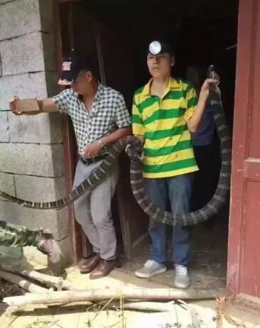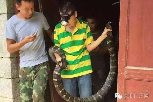 @钱江晚报:【温州抓住的重量级眼镜王蛇,重11公斤,体长近4米】三天前的深夜,家住温州泰顺县仕阳镇杨梅岭的林大伯推开家门,被眼前的景象吓坏了:一条碗口粗黑白花纹的大蛇,正在吞食一条看上去有三四斤重的草花蛇。林大伯立即关上家门,逃了出来。冷静下来后,他报了警。昨天,泰顺县林业局工作人员说,他们将选择合适地点将蛇放生。