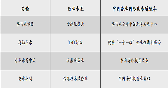 国际“四大”会计师事务所指毕马威(KPMG)、德勤(DTT)、普华永道(PWC)和安永(EY)四家会计师事务所。如果以德勤于1917 年在上海设立了首家办事处算起,国际会计事务所进入中国的历史接近百年。新中国成立后,国际“四大”时至1992年才获准以合资形式进入中国。经过20年的发展,国际“四大”占全国会计师事务所业务收入的比重由1992年的0.05%迅猛上升至23%。国际“四大”在全球网络资源、专业服务能力和经验、目标国家服务经验等方面都具有领先优势。为了满足中国企业走出去的相关需求,国际四大会计事务所纷纷设立相关部门。