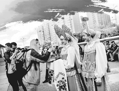 在布拉戈维申斯克,俄罗斯姑娘用面包和盐欢迎中俄主流媒体联合采访团。 |