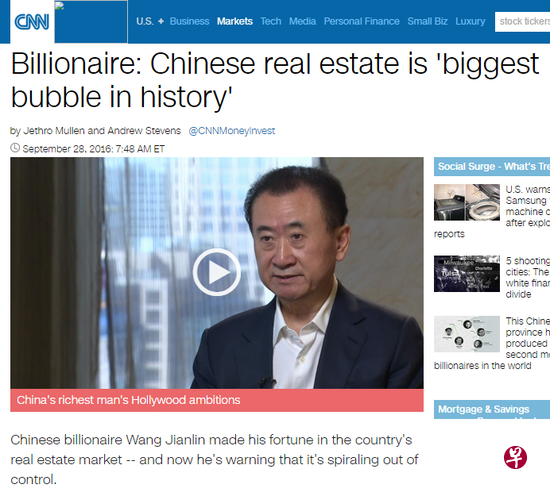 (联合早报网讯)万达集团董事长王健林28日接受美国有线电视新闻网财经频道(CNNMoney)采访时表示,中国房地产目前的市场泡沫是历史上最大的泡沫。